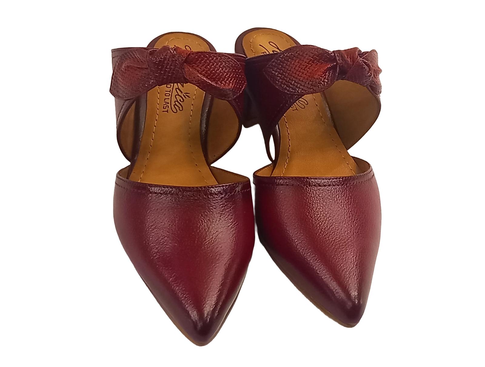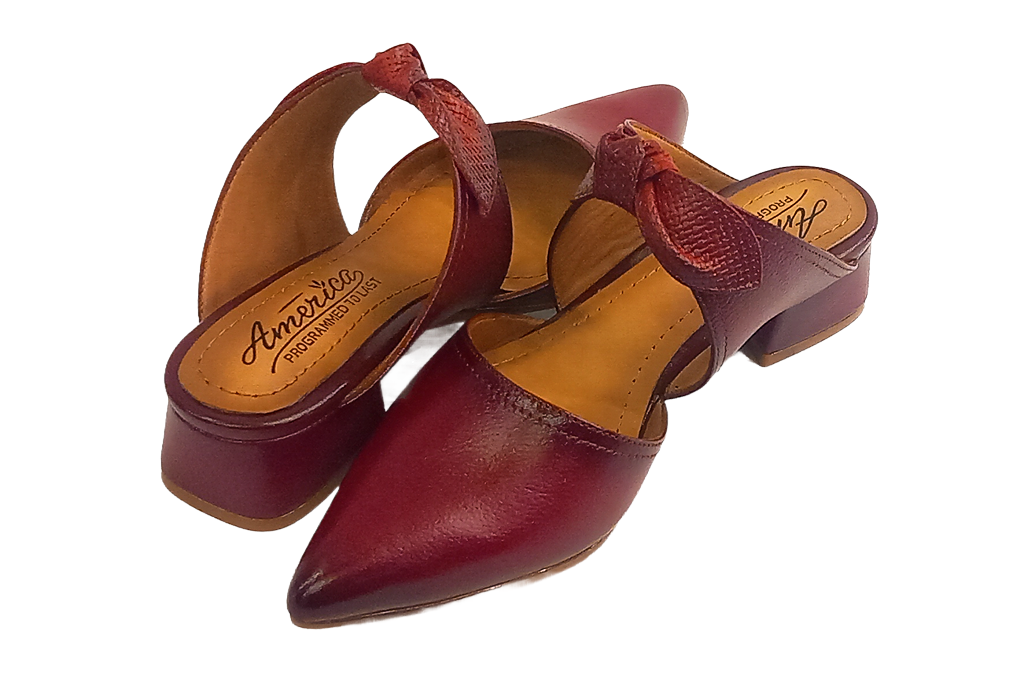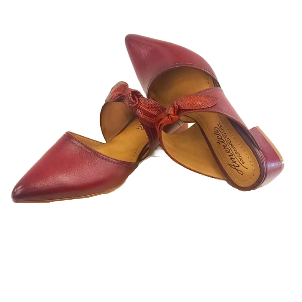 Slaps Código: 1403 Color: rojo Taco: x3 Precio: 199 Características: zapatos abiertos en la parte del talon de cuero, adornado con un liston de cuero grabado en forma de cuadro, con forro de badana y planta huella